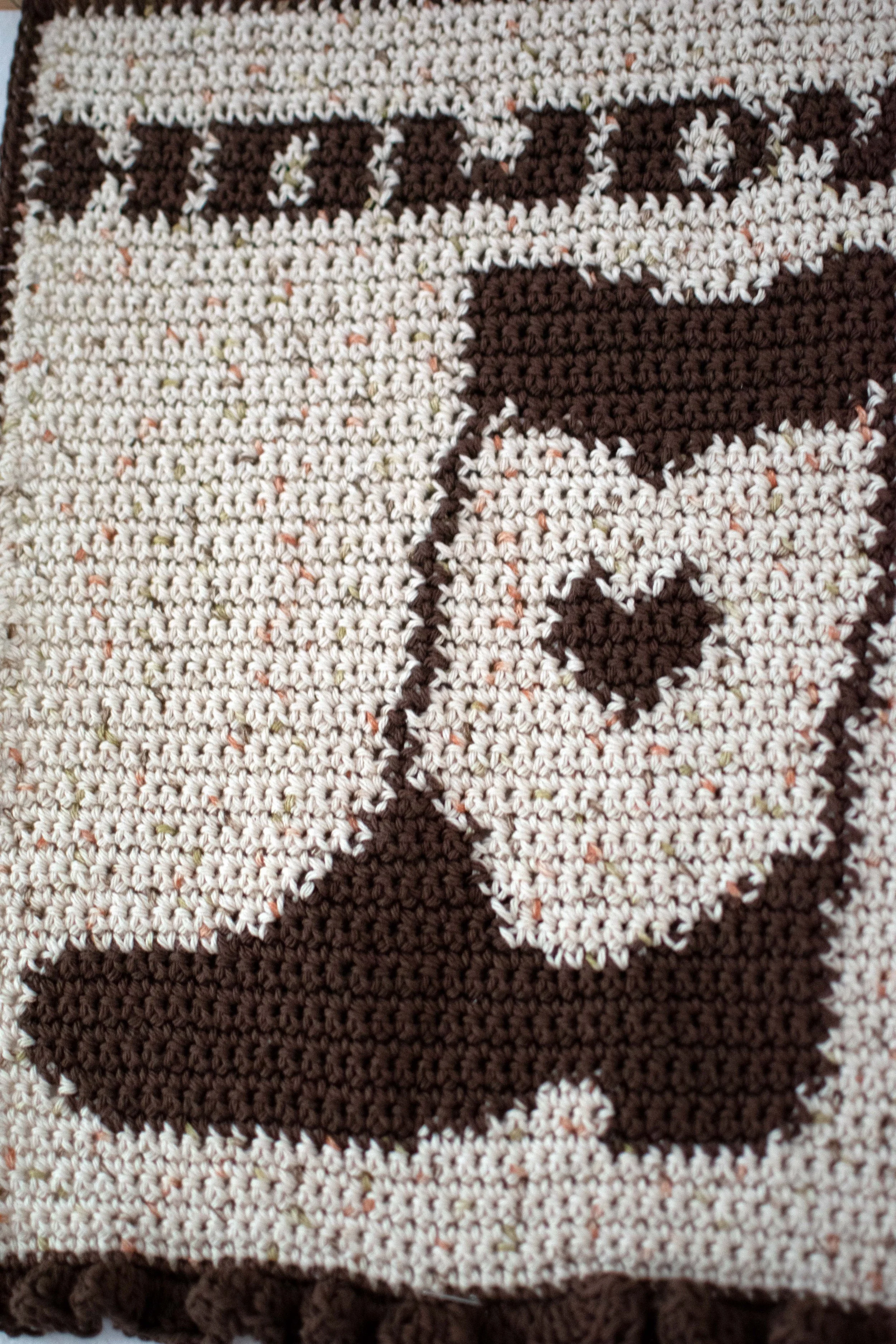 This is a fun cowgirl boot pattern with the text, “Howdy “ above! The main part of the piece was made using single crochet, but the border was done at the end using half double crochet. In addition to the border, I added a ruffled edge on the bottom. To achieve this, simply place 3 double crochets in each stitch. If you want it less ruffly, go down to 2.